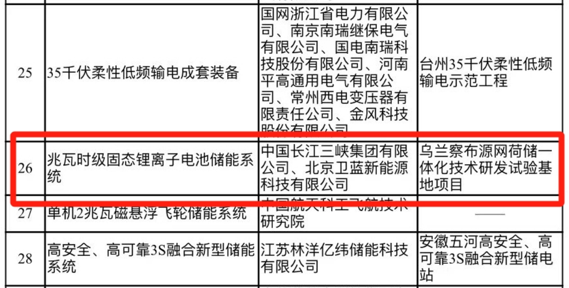 10月24日,國家能源局2023年第6號(hào)公告公布第三批能源領(lǐng)域首臺(tái)(套)重大技術(shù)裝備(項(xiàng)目)名單,此次共計(jì)有58個(gè)技術(shù)裝備(項(xiàng)目)入選,其中儲(chǔ)能領(lǐng)域項(xiàng)目8個(gè),由衛(wèi)藍(lán)新能源與中國長江三峽集團(tuán)共同研制的“兆瓦時(shí)級(jí)固態(tài)鋰離子電池儲(chǔ)能系統(tǒng)”榜上有名。