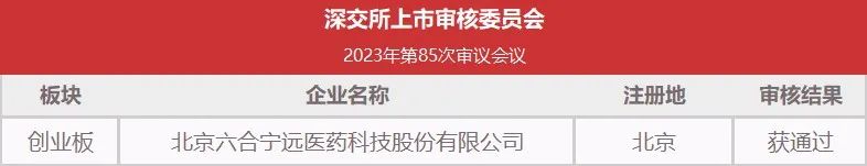 深圳證券交易所上市審核委員會定于2023年11月23日召開2023年第85次上市審核委員會審議會議。會議結(jié)果公告顯示,北京六合寧遠(yuǎn)醫(yī)藥科技股份有限公司(簡稱六合寧遠(yuǎn))首發(fā)申請獲上市委會議通過,公司擬在創(chuàng)業(yè)板上市。